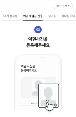 재발급 하기 전에 준비물이 필요합니다. 여권용 사진입니다. 여권용 사진의 규격에 맞는 형태의 사진으로 jpg,jpeg,png 파일만 가능하고요, 용량은 500kb 이하여야합니다. 신청일 기준 6개월 이내 촬영한 사진이어야합니다.